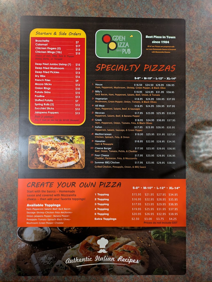 The menu at Ogden Pizza & Pub offers a diverse range of dishes to cater to various tastes. For those craving hearty comfort food, options like the Steak Philly /W Fries, Fully Loaded Burger /W Fries, and the Tex Mex Burger /W Fries stand out. Seafood lovers can indulge in the Fish & Chips, Jumbo Shrimp Dinner (7) /W Stuffed Potato, or the Fillet of Salmon /W Rice. Pizzas are a major highlight, with choices such as the Hawaiian, Summer BBQ Chicken, and Four Cheese among the 12" specialty large pizzas, or smaller options like the Cheese Burger and Vegetarian pizzas in the 8" and 10" sizes. Stir-fry enthusiasts can enjoy the Chicken Stir-Fry, Shrimp Stir-Fry, or Beef Stir-Fry, while the pasta menu features comforting dishes like Spaghetti Carbonara, Baked Lasagna, and Fettuccine Alfredo. For appetizers, options like Calamari, Poutine, and Deep Fried Jumbo Shrimp (7) are perfect for sharing. The restaurant also offers customizable pizzas in various sizes with different topping combinations, from the small 8" to the larger 14". Additional combos like the Chicken Fingers Combo and Wings Combo are great for those seeking a quick, satisfying meal. To round out the experience, beverages include 2-litre and can pops, while desserts like Chocolate Edge Ice Cream and Apple Pie with Rum Sauce provide a sweet end to any meal. For those looking for something more substantial, entrees like the New York Steak Dinner (7oz) and Veal Cutlets are available, ensuring there's something for everyone.